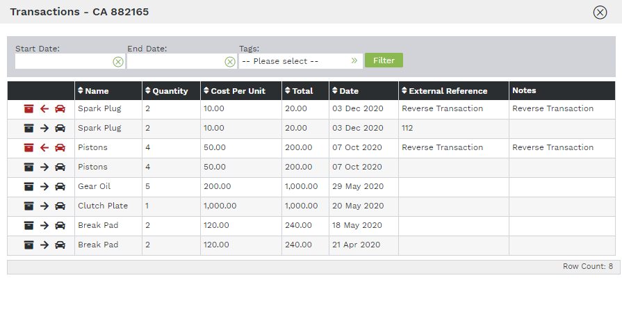 De manera muy similar a un sistema de inventario, los consumibles pueden asignarse a vehículos específicos. Cuando se pide un stock, la función de consumibles de 3Dtracking registra los detalles del proveedor, la fecha de recepción y la asignación de vehículos. Ayudando a reducir el volumen de las existencias en mano, los gestores de flotas también tienen una visión permanente de las existencias de materiales en el almacén. Vea este ejemplo: